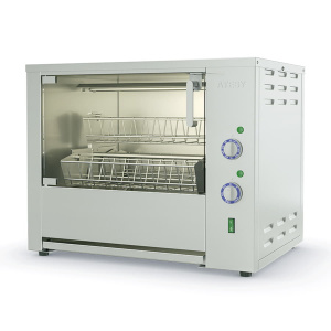 В гриле можно готовить как целые тушки кур, так и их отдельные части. Механизм торможения позволяет четко фиксировать положение садков во время остановки вращения. Сочетание скорости вращения и мощности привода обеспечивает качественное приготовление кур при любой (даже несимметричной) загрузке. Двери выполнены из термостойкого ударопрочного стекла. Корпус гриля изготовлен из пищевой нержавеющей стали AISI430.