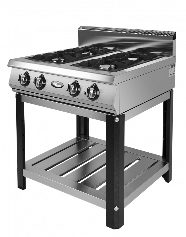 4 профессиональные горелки класса Heavy Duty, газовая мощность 27 kW, газ/контроль, 3 горелки по 6.5 кВт, 1 - 9 кВт, подставка полностью разборная c 1 нейтральной полкой, плита и подставка из н/стали, г.нетто 800x800x1050 80кг, г.брутто: 890х890х650, 105кг