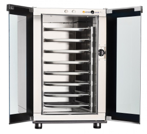 Шкаф может разместить до 8 противней формата GN 1/2 или GN 2/3, а расстояние между уровнями составляет 75 мм, что обеспечивает удобство в использовании. Корпус устройства выполнен из нержавеющей стали, что гарантирует долговечность и легкость в уходе.