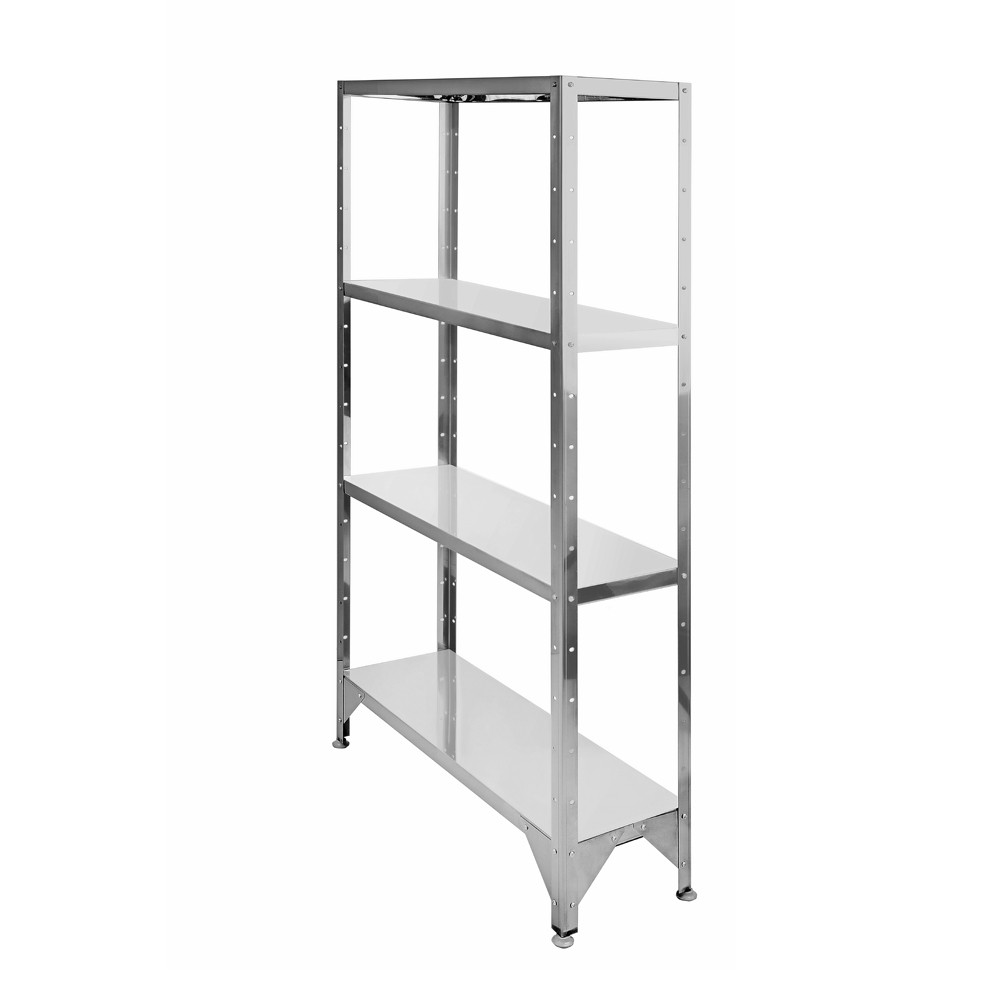 Конструкция включает четыре прочные полки и четыре стойки, выполненные из оцинкованной, крашеной или нержавеющей стали. Полки изготовлены из пищевой нержавеющей стали AISI430, имеют толщину 0,6 мм и усилены ребром жесткости, что обеспечивает их долговечность и надежность. Полки можно устанавливать на различных уровнях с шагом 96 мм, что позволяет адаптировать стеллаж под конкретные нужды.
