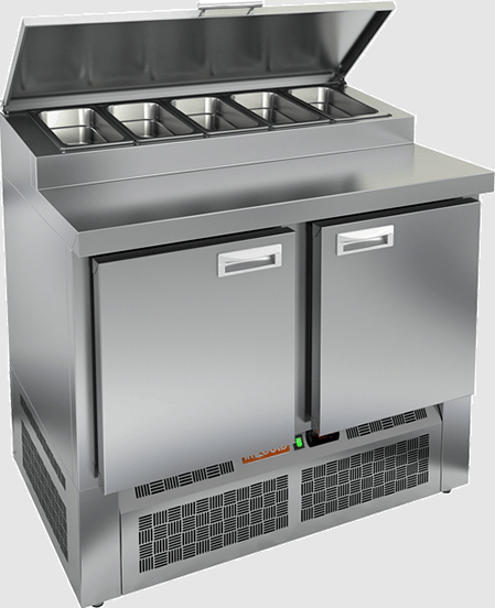 Толщина теплоизоляции составляет 50 мм, а система охлаждения — динамическая, что гарантирует равномерное распределение температуры. Автоматическая оттайка и электронная панель управления делают эксплуатацию стола максимально комфортной. Рабочая поверхность имеет глубину 324 мм и высоту 850 (990) мм, а вместимость составляет 5 контейнеров GN1/3. В комплект входят две полки размером 530х325 мм (GN 1/1), а также регулируемые по высоте ножки и автоматические доводчики дверей с фиксатором открытого положения, что добавляет удобства в использовании. Легкозаменяемые магнитные уплотнители обеспечивают надежную герметичность.