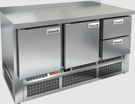 Столешница имеет толщину 50 мм и также выполнена из нержавеющей стали, что гарантирует прочность и устойчивость к повреждениям. Высота рабочей поверхности составляет 850 мм, что обеспечивает комфортные условия для работы. Модель имеет динамическую систему охлаждения и автоматическую оттайку, что упрощает эксплуатацию.