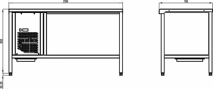 Вес нетто достигает 65 кг. Холодильный агрегат расположен сбоку, что обеспечивает удобный доступ и оптимальное использование пространства. Стол также оборудован одной полкой, выполненной из окрашенной оцинкованной проволоки, что позволяет удобно организовать хранение.