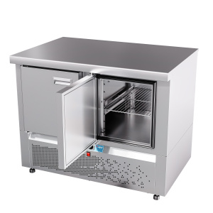 Стол имеет две регулируемые по высоте полки-решетки формата GN 1/1, а уплотнители с магнитной вставкой на дверях обеспечивают надежную герметичность. Легкосъемные передняя и задняя стенки упрощают доступ к внутренним компонентам, а регулируемые ножки могут быть заменены на колеса для удобства перемещения.