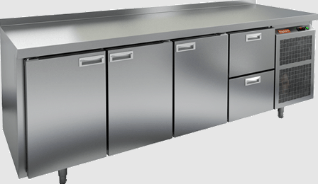 Морозильный стол оснащен динамической системой охлаждения и автоматической оттайкой, что упрощает его эксплуатацию. Электронная панель управления позволяет точно настраивать необходимые параметры. В комплект входят три полки размером 530х325 мм (стандарт GN 1/1), а также регулируемые по высоте ножки и автоматические доводчики дверей с фиксатором открытого положения. Легкозаменяемые магнитные уплотнители обеспечивают надежную герметичность.