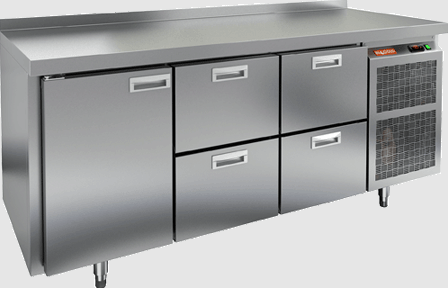 Холодильный агрегат расположен с правой стороны, что позволяет оптимально использовать пространство. Стол соответствует гастрономическим стандартам и имеет бортик для предотвращения проливов. Устройство работает от сети с напряжением 220 В и мощностью 600 Вт.