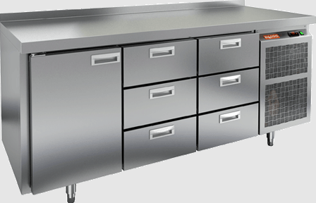 Объем морозильной камеры достигает 505 литров, что делает его идеальным выбором для заведений с высокой проходимостью. Холодильный агрегат расположен справа, что оптимизирует использование пространства. Стол соответствует гастрономическим стандартам и имеет бортик, предотвращающий случайное падение продуктов.