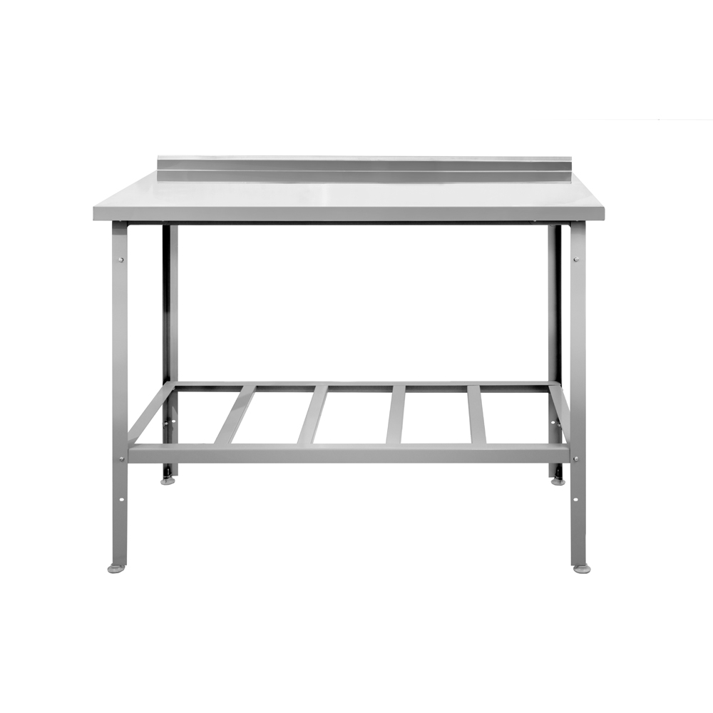 Столешница прямоугольной формы выполнена из пищевой нержавеющей стали AISI 430 и дополнительно укреплена листом древесно-стружечной плиты, что обеспечивает высокую прочность и предотвращает прогиб. Все кромки столешницы имеют специальное подгибание, что исключает риск травмирования персонала во время эксплуатации и санитарной обработки.