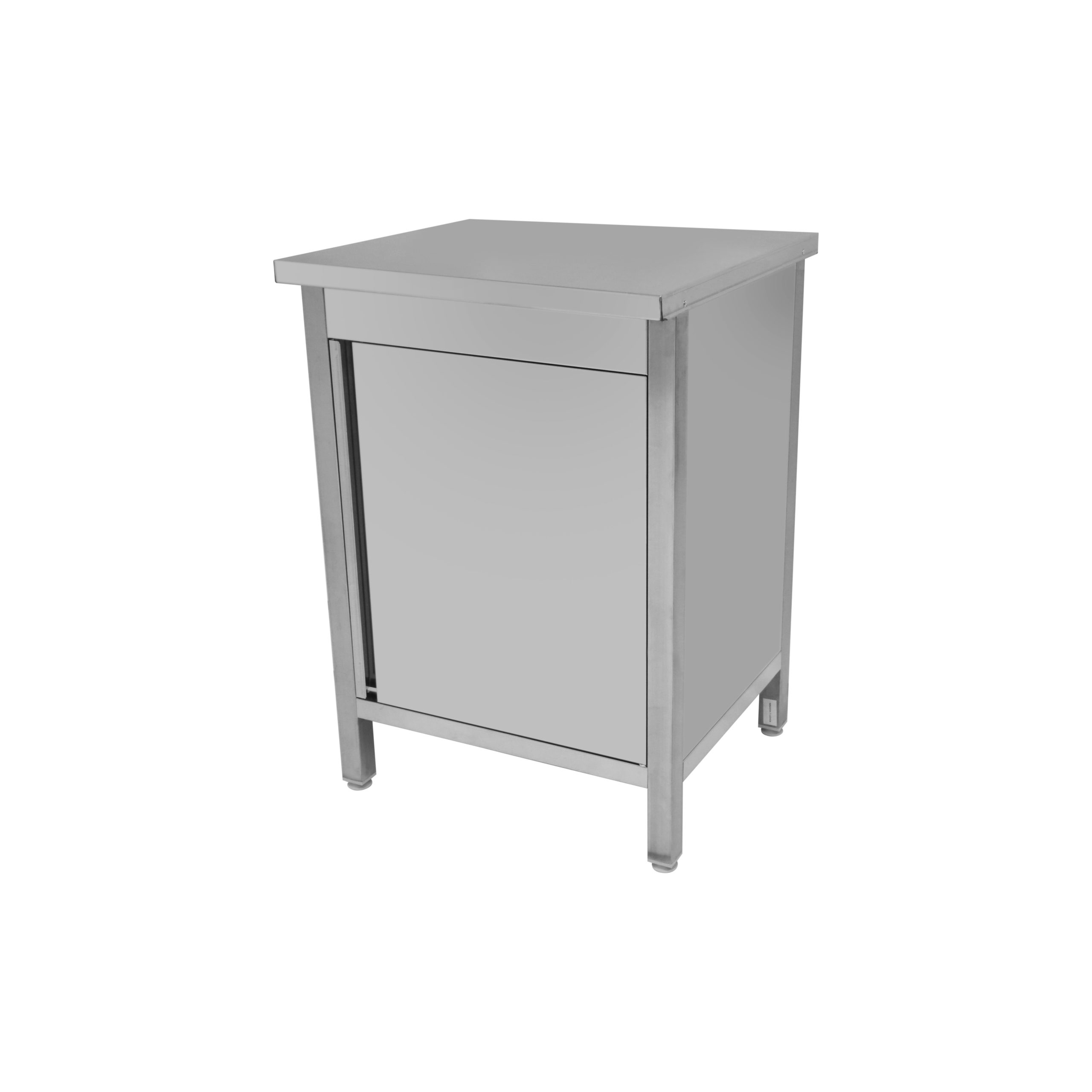 Стол с распашными дверцами имеет прямоугольную столешницу, выполненную из пищевой нержавеющей стали AISI 430, которая дополнительно укреплена древесно-стружечной плитой с внутренней стороны. Это обеспечивает высокую прочность и предотвращает прогиб столешницы. Каркас и полка изготовлены из крашеной стали, а все кромки столешницы обработаны, что исключает риск травм при использовании и санитарной обработке. Отсутствие борта позволяет удобно размещать стол в любом уголке помещения и работать с любой стороны.