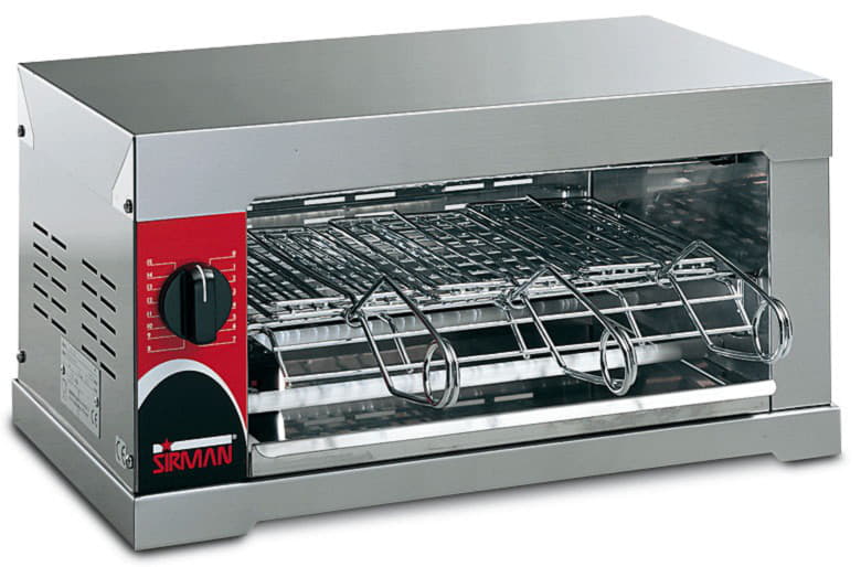 Тостеры 6Q идеальны для подогрева пиццы, бутербродов и полуфабрикатов, а также для приготовления гамбургеров, сосисок, тостов с начинкой и пресных лепешек «пьядина». Тостеры изготовлены полностью из нержавеющей стали, снабжены съемными решётками и лотком для сбора остатков, что упрощает очистку. Хромированные нержавеющие щипцы и таймер на 1-15 минут входят в комплект поставки. Селектор для отключения нижних нагревательных элементов предлагается в качестве опции.