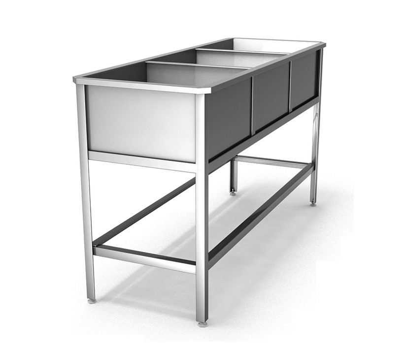 Каркас данной ванны может быть изготовлен из крашенной, оцинкованной или нержавеющей стали, а его стойки выполнены в виде уголков. Обвязка осуществляется с четырех сторон, что придаёт конструкции дополнительную прочность. Все кромки имеют подгиб, что исключает возможность травмирования персонала во время сборки, эксплуатации и санитарной обработки. Опорные ножки регулируются по высоте, что позволяет адаптировать ванну под любые условия.