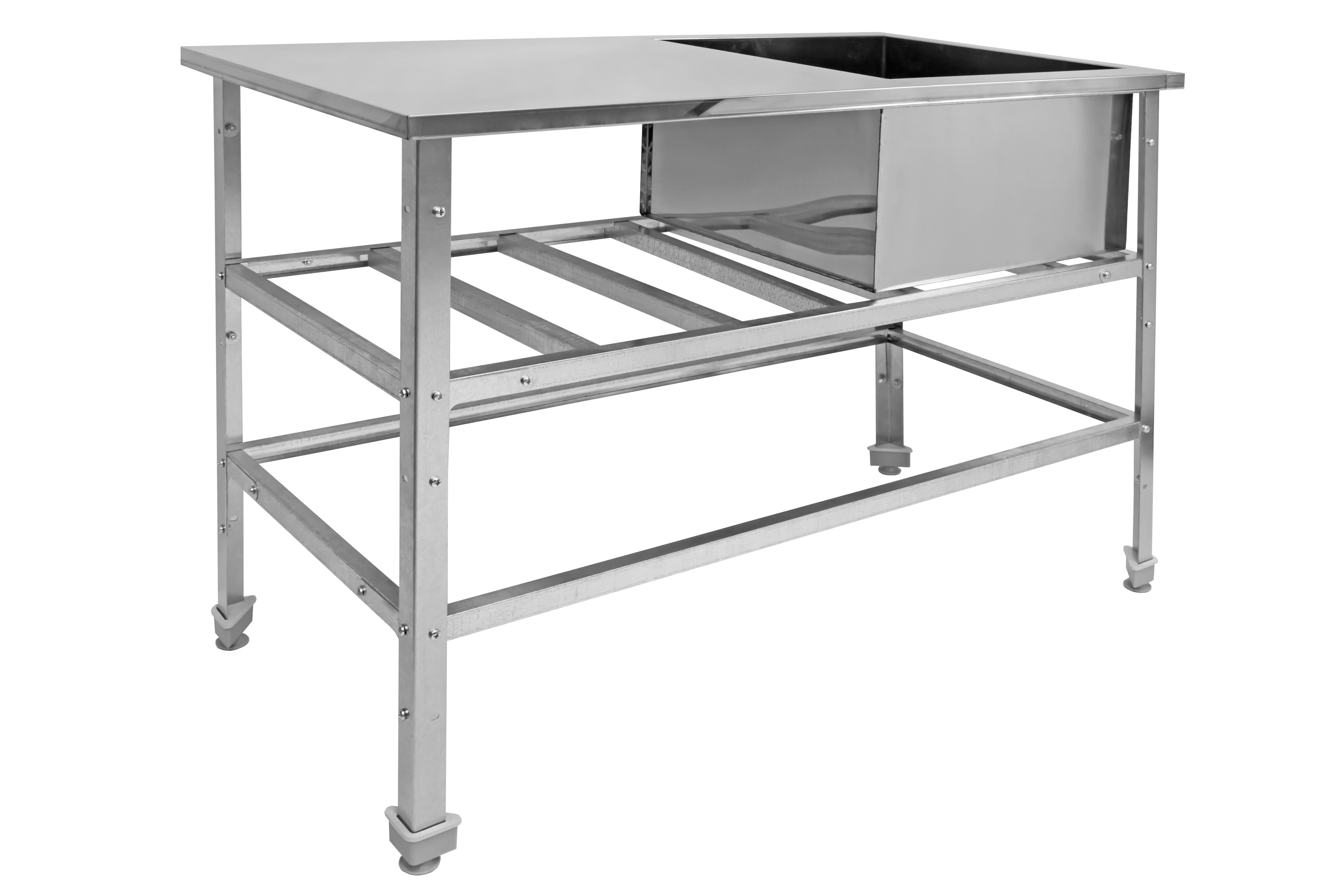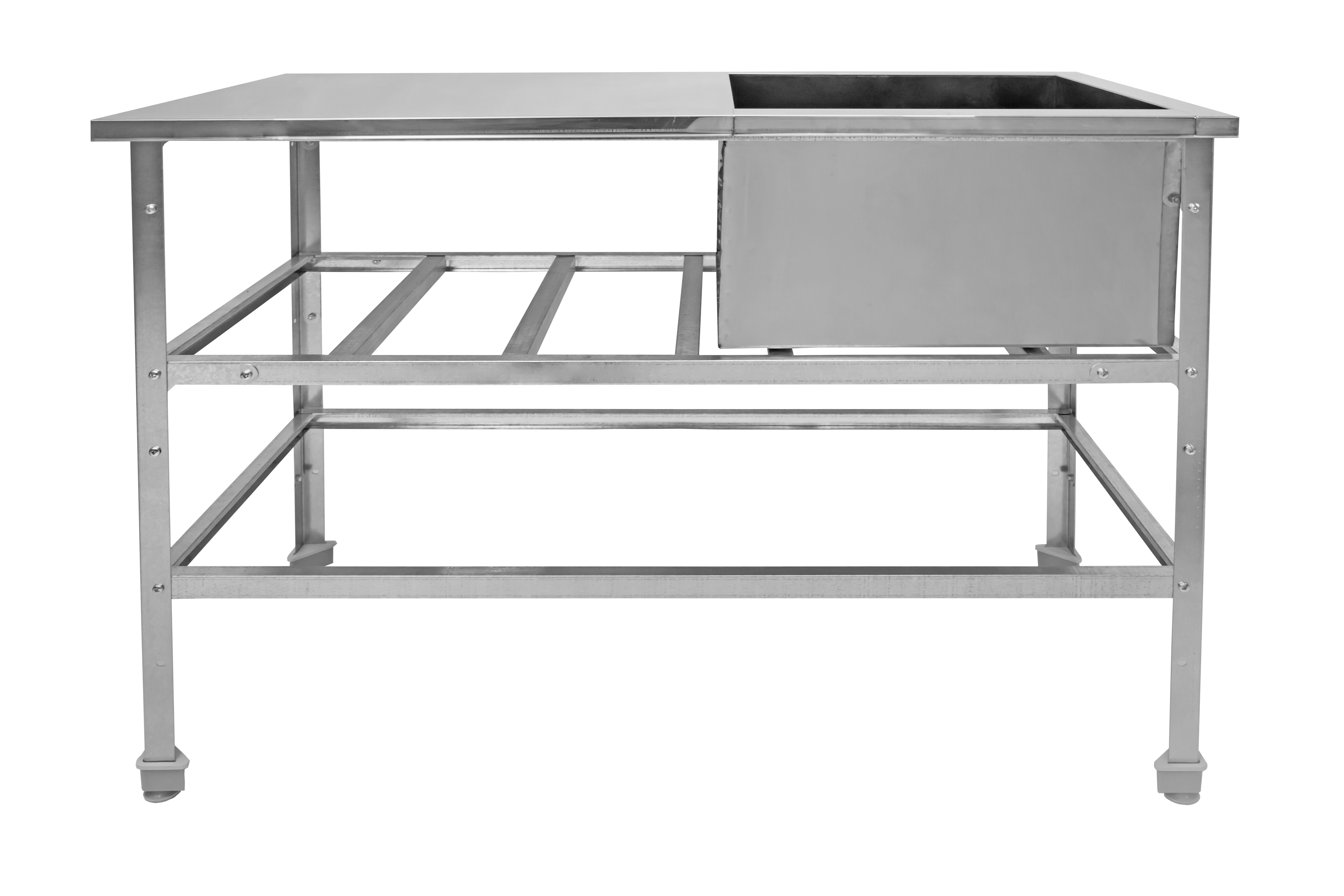 Ванна не имеет борта и отверстия под смеситель, а диаметр сливного отверстия составляет 50 мм. Толщина металла как ванны, так и рабочей поверхности составляет 0,8 мм, что гарантирует надежность конструкции. Каркас может быть выполнен из: