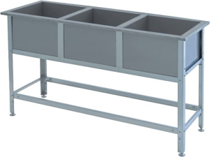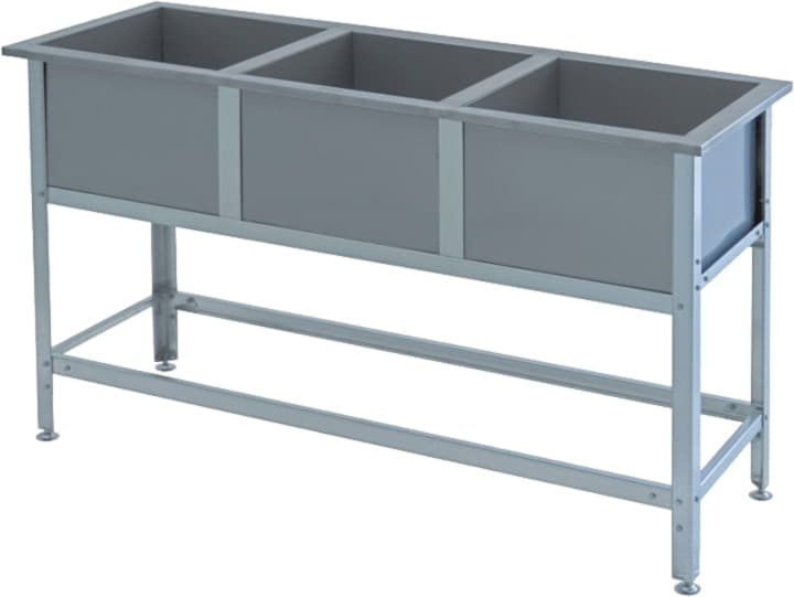 Моечная ванна VIATTO ВСМ-3/430-ЮТ-Э предназначена для ручного мытья посуды, кухонного инвентаря и различных продуктов питания. Для безопасной и комфортной работы бортики подогнуты, а ножки регулируются по высоте. Мойки изготовлены из нержавеющей стали толщиной 0.6 мм, каркас - из оцинкованной стали толщиной 1.5 мм.